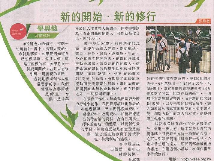 書中最後提出觀點:重新出發的契機。身處在教育這個行業有點意思,源自9月的矛盾性。9月意味着一年已過了大半,只剩3個月,還有甚麼想實現的事嗎?9月也象徵了開始,因為在新的學年,一切都得重新流轉與整理,而更新的代名詞是「改變」,以及未知的到來與發生,讓人如履薄冰卻真實地感受着。如書本所說,創造力是生而為人的本質,是我們與生俱來的權利。